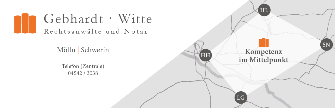 Wir, die Rechtsanwälte Gebhardt – Witte und Partner, sind eine Kanzlei, die seit über dreißig Jahren in der Stadt Mölln inmitten der schleswig – holsteinischen, zwischen Hamburg und Lübeck gelegenen Ferienregion Herzogtum Lauenburg erfolgreich tätig ist und in welcher derzeit drei Rechtsanwälte, davon zwei Notare, sowie sechs weitere Personen beschäftigt sind. Zu ihren Mandanten gehören zahlreiche mittelständische Betriebe. Infolgedessen bilden gesellschaftsrechtliche, vertragsrechtliche, arbeitsrechtliche, gewerberechtliche und baurechtliche Angelegenheiten, letztere auch im öffentlichen Recht, Schwerpunkte ihres Wirkens. Mit Blick auf diese Ausrichtung kooperiert die Kanzlei eng mit der Steuerberaterpraxis Fock & Partner, die sich im selben, eigens hierfür vor 10 Jahren neu errichtetem Bürogebäude befindet.